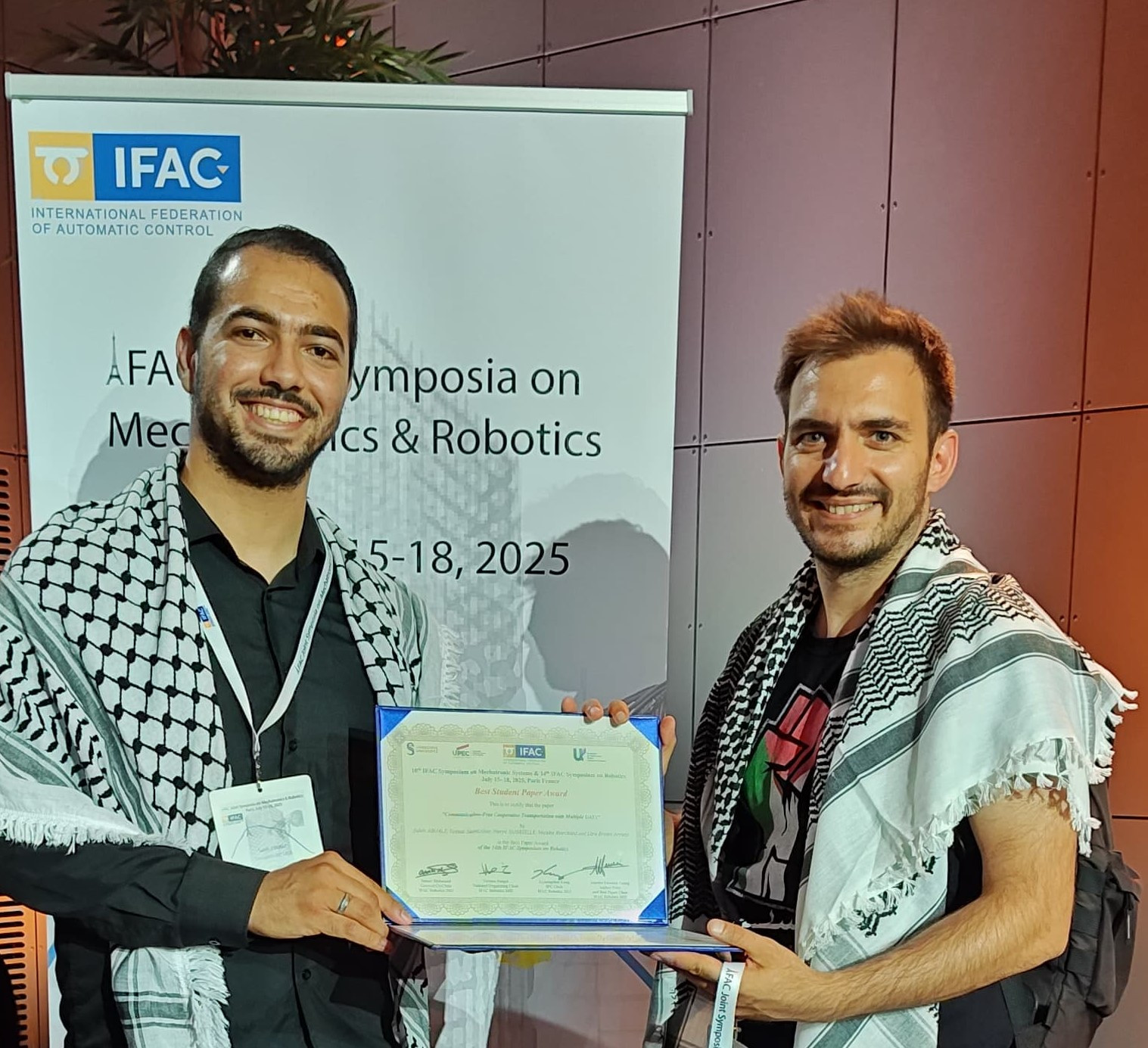 Toutes nos félicitations à Saleh Abuali (encadré par Nicolas Marchand, Bogdan Robu et Lara Briñón-Arranz) et Kostas Skantzikas (encadré par Nicolas Marchand et Lara Briñón-Arranz), lauréats du Prix : Robotics Best Student Paper Award, IFAC Joint Symposia on Mechatronics & Robotics. Ce prix leur a été décerné le 18 juillet 2025 pour l’article "Communication-Free Cooperative Transportation with Multiple UAVs" rédigé par Saleh Abuali, Kostas Skantzikas, Pierre Susbielle, Nicolas Marchand et Lara Briñón-Arranz.