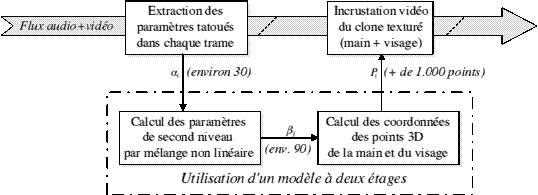 Le paradigme de la modélisation articulatoire proposé par l'ICP sera utilisé pour la synthèse automatique à partir du (télé)texte et l'animation du clone. Au final, un faible nombre de paramètres (une trentaine pour l'ensemble visage+main, quelle que soit la résolution en points ou triangles des modèles qui seront incrustés à l'écran) permettra au récepteur de reconstituer fidèlement l'animation originale et de préserver sa sémantique. Le décodeur possède en effet une copie du modèle de (dé)codage, qui exprime les coordonnées des points et leurs relations avec les paramètres articulatoires.