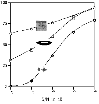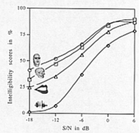 On sait (partie gauche de la figure III.2) que face à un signal audio de parole de plus en plus bruité, l'intelligibilité est meilleure et décroît moins vite si l'on peut voir les lèvres ou le visage du locuteur réel. C'est la cohérence et la complémentarité audio-visuelle de la parole qui permet ce gain d'intelligibilité. Ce gain doit pouvoir être constaté sur des visages 3D si leur articulation est suffisamment correcte. Cela a déjà pu être vérifié (partie droite de la figure III.2), avec des scores sensiblement plus faibles, pour des images de synthèse assez sommaires (lèvres 3D, modèle de visage grossier).