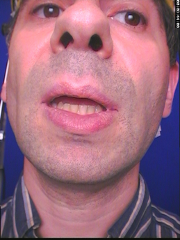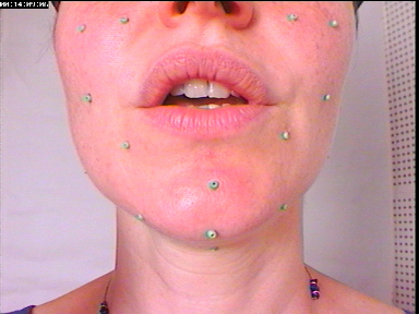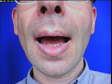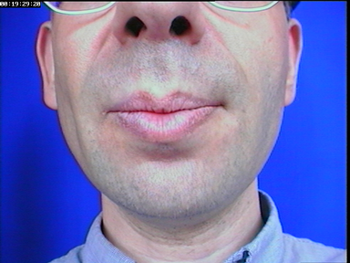 Le corpus parfait de test n'existe donc pas. Pour complémenter les précédents, lors de l'enregistrement du dernier clone créé, le visage avait de plus été filmé avec une prise de vue de type de labiophonie alors qu'avait déjà été collé un sous-ensemble des billes qui serviraient à l'enregistrement des visèmes. La zone des lèvres ne comporte aucune bille, comme on peut le voir sur la figure II.5.