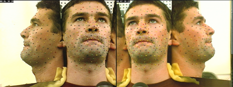 C'est le corpus de contrôle le plus proche des conditions de l'application : grâce au très petit nombre de billes visibles, qui font partie du modèle de construction du clone, on est capable d'inverser plus formellement (sans texture ni synthèse) l'articulation et la position du modèle, pour les comparer au résultat de l'analyse/synthèse qui serait réalisée dans les conditions de la labiophonie (rehaussement du contraste de lèvres). Bien sûr, pour que le faible nombre de billes intervienne le moins possible, la texture utilisée par l'analyse ne les modélise pas.