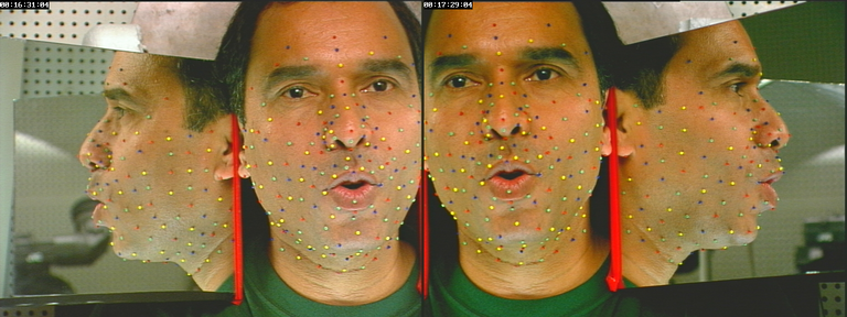 L'algorithme a été utilisé pour analyser une séquence vidéo complète (vue de face et de profil, avec les billes de l'apprentissage, comme sur la moitié gauche de la figure II.3) : la posture articulatoire et le mouvement de la tête ont été suivis à 50 Hz sur une séquence vidéo de 36 secondes de la fable «La bise et le soleil». Le jeu final de paramètres obtenu sur une image donnée était utilisé sur l'image suivante comme le centroïde du simplexe initial.