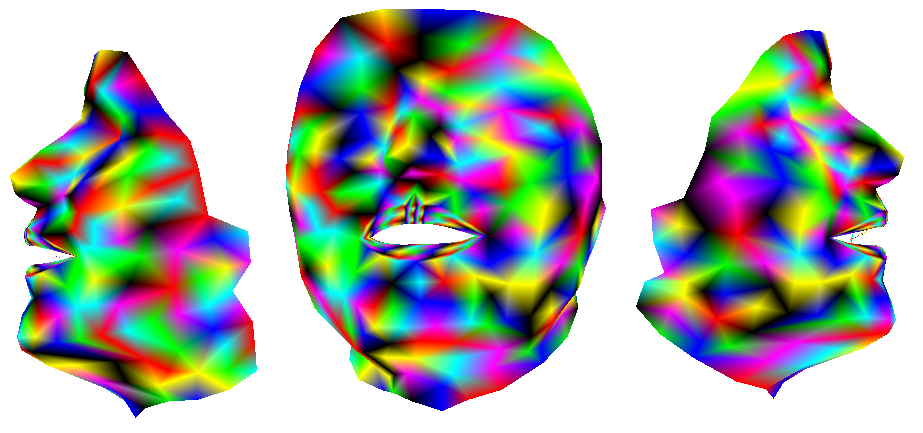On opère ici sur les images de visèmes qui ont servi à construire les clones (comme sur la figure II.2). La procédure d'inversion bénéficiera des billes collées sur le visage du locuteur, qui augmentent la richesse de la texture, et des vues de face et de profil, qui reflètent le caractère 3D de l'information. L'analyse utilise un modèle de synthèse où la texture inclut les billes. Il n'y a pas de rehaussement du contraste lèvres/peau, les fonctions de pré-traitement f dans l'équation 1 ne font que normaliser les données RGB par leur luminance.
