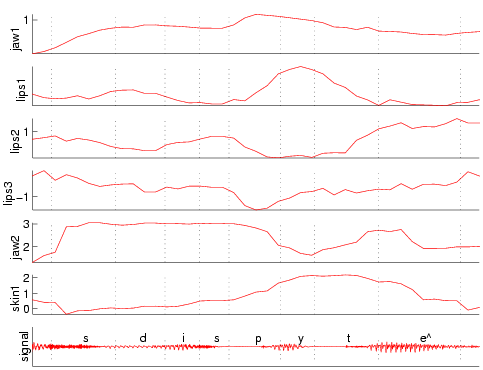 Un extrait des résultats de suivi est disponible sur la figure III.3. Les paramètres évoluent assez régulièrement, et en accord avec la phonétique articulatoire : pour [y], on observe une franche protrusion (paramètre lips1) conjuguée à une faible rétraction de la mâchoire. La remontée de la mâchoire (jaw1) est maximale pour le [p].