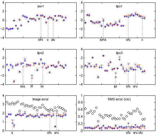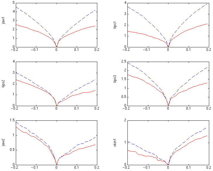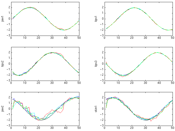 Comme précédemment, on a bien sûr cherché à vérifier sur plusieurs séquences vidéos que les trajectoires des paramètres articulatoires étaient régulières et que les mouvements du visage recouvrés étaient phonétiquement pertinents : c'est effectivement le cas, mais les deux paramètres les plus faibles (jaw2 et lar1) semblent très bruités, du fait de la caméra unique et/ou de l'absence de marqueurs. Dans ces même conditions, on a pu vérifier que l'optimisation de l'orientation de la tête ne fonctionnait pas (bruit important à l'inversion).